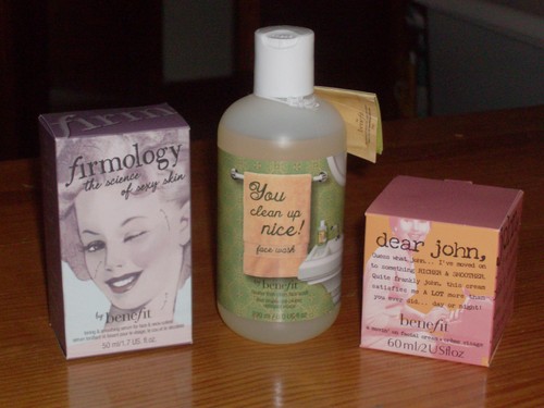 O gel de limpeza YOU CLEAN UP NICE limpa em profundidade e não tem sabão nem óleo, logo serve para peles mais oleosas, mas também sensiveis. O serum, que é mais uma loção, FIRMOLOGY, contém pigmentos de luz que ajudam a pele a parecer mais radiosa e macia, e pode ser usada tanto de manhã como de noite. O creme DEAR JOHN, também pode ser usado de manhã ou à noite e é mais hidrante e macio, mais próprio para usar de noite ou no Inverno.