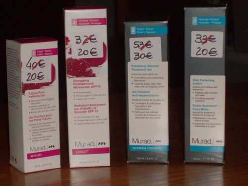 A marca DR. MURAD é das mais prestigiadas e caras do mercado. O seu criador é o desmatologia das estrelas e os seus produtos são muito reputados. E com estes preços podemos mimar um bocadinho mais a nossa pele. Ora vejam: da linha peles oleosas comprei o EXFOLIANTING BLEMISH TREATMENTE GEL, que é tipo um serum que se utiliza antes do creme habitual, mais aconselhavelmente, de noite, porque deixa a pele foto-sensivel e o resultado é mais intenso, seca as borbulhas, controla a oleosidade e desobstrói os poros. A seguir é usar a SKIN PERFECTING LOTION, sem óleo, para hidratar e refinar a textura da pele. Outra linha, a VITALIC, é para dar brilho e deve usar-se de manhã. Começa-se com o T-ZONE PORE REFINING GEL, que esfolia e purifica a zona T do rosto (testa, nariz e queixo), a que costuma ser mais oleosa e depois o ENERGIZING POMEGRANATE MOISTURIZER SPF15, que além da protecção solar essencial, hidrata e deixa a pele macia.