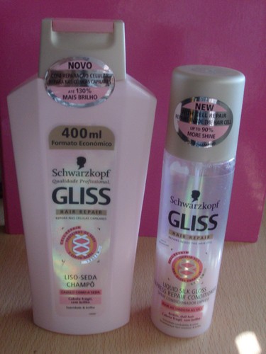 No cabelo, uso uma infinidade de coisas, mas tudo da mesma marca - a minha preferida - a GLISS. Uso 3 linhas desta marca: diariamente uso a LISO SEDA, que deixa o cabelo macio e desembaraçado, fácil de pentear. Uso o Champô e o Condicionador em spray que dá brilho e hidrata.Contém proteinas de seda.