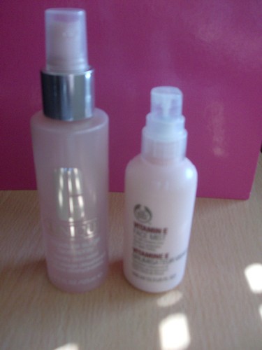 Estou a usar o MOISTURE SURGE FACE SPRAY na minha nova rotina de beleza. É, de facto, um produto muito bom que hidrata a pele de imediato e pode ser usado também durante o dia, até por cima da maquilhagem, para refrescar e hidratar. No entanto, e até para ser um produto da CLINIQUE, é caro! Um fraco destes custa 35€!!!! Já vou quase a meio e comecei a pensar como o iria substituir... até que me lembrei de outra marca, muito mais em conta, e cujo produto tem o mesmo objectivo - hidratar! É o VITAMIN E FACE MIST da BODY SHOP que custa cerca de 10€. Contém vitamina E, um poderoso hidratante e cheira a água de rosas. Para as que não quiserem gastar tanto dinheiro com um tónico, podem também comprar ÁGUA DE ROSAS em qualquer supermercado por cerca de 1€ que faz, praticamente, o mesmo efeito!![]()