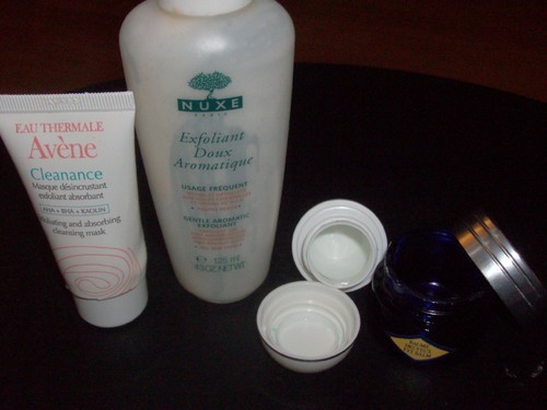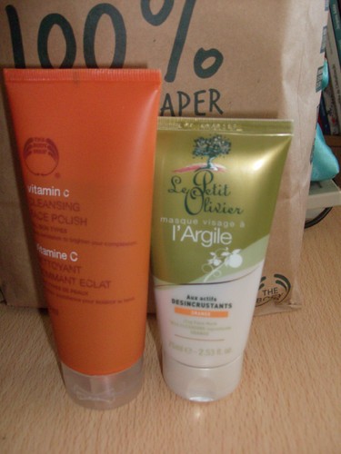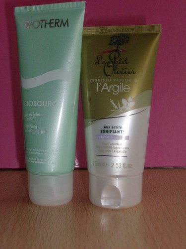 Para esfoliar estou a usar o GEL EXFOLIANT CLARIFIANT da BIOTHERM, que tem um cheirinho maravilhoso e muito fresco e umas particulas esfoliantes muito eficazes, mas suaves com a pele. Já estou a usar também a máscara que comprei do LE PETIT OLIVIER, a que tem prepriedades tonificantes de Menta e Lavanda e estou a ADORAR! Tem um cheiro super refrescante a Lavanda e realmente deixa a pele mais fresca, limpa e mais clara! Muito boa mesmo!