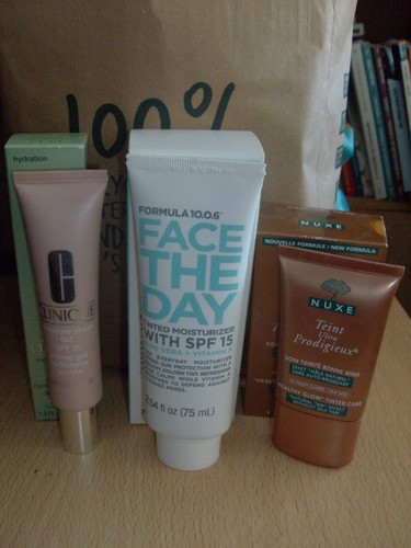 O MOISTURE SHEER TINT SPF 15 da linha MOISTURE SURGE da CLINIQUE, que refresca, hidrata, protege dos raios solares e dá um toque de cor. Contém Aloe Vera, Camomila e Cafeina e custa cerca de 20€. O FACE THE DAY SPF15 da FORMULA 10.0.6, que contém Aloe Vera e Vitamina A para acalmar a pele e limpar os poros, ao mesmo tempo que hidrata e dá cor. Na Sephora por 9,90€. Por fim, o TEINT ULTRA PRODIGIEUX SOIN TEINTÉ BONNE MINE, com chá preto e raiz de chicória, para promover um auto-bronzeamento, hidratar e dar luminosidade ao rosto. Acho que não tem protector solar, por isso, compensem! Custa cerca de 25€ nas farmácias.