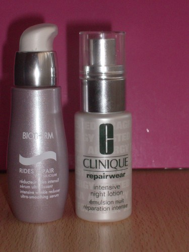 De noite uso o o sérum RIDES REPAIR da BIOTHERM, não por causa das rugas, mas porque faz uma exfoliação durante a noite que deixa a pele mais limpa e sem tantas imperfeições. E termino com a REPAIRWEAR INTENSIVE NIGHT LOTION da CLINIQUE que deixa a pele aveludada e ajuda a recuperar das agressões do dia-a-dia.