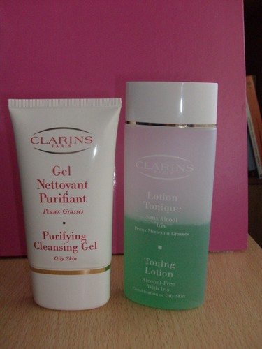 Para a limpeza facial estou a utilizar o GEL NETTOYANT PURIFIANT e a LOTION TONIQUE D'IRIS, ambos da CLARINS.
