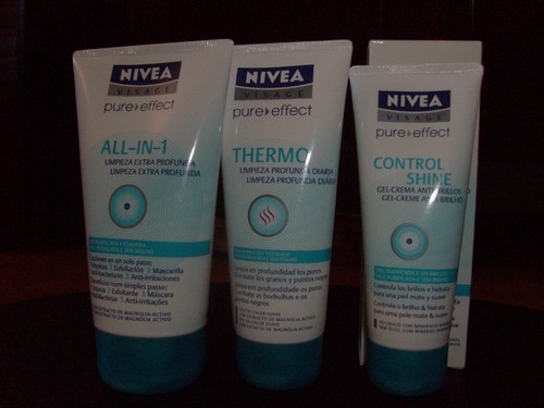 A primeira, e dando seguimento ao post anterior, é da NIVEA. A linha NIVEA YOUNG, agora PURE EFFECT, tem um novo look e novos produtos. Tem agora o ALL IN 1 LIMPEZA EXTREMA PROFUNDA, uma máscara, creme de limpeza e exfoliante, do género da GARNIER, com extracto de magnólia e com o cheirinho caracteristico da NIVEA. Tem propriedades anti-bacterianas e particulas exfoliantes para combater borbulhas e pontos negros. Tem também um exfoliante, o THERMO LIMPEZA PROFUNDA DIÁRIA, que limpa em profundidade os poros, porque tem um "efeito calor suave". Por fim, o CONTROL SHINE, GEL-CREME ANTI-BRILHO, sem óleo, com minerais marinhos e com protecção UVA/UVB, mas baixa, pelo que no verão se aconselha a usar um protector adicional. Todos os produtos dentro dos 6,50€.