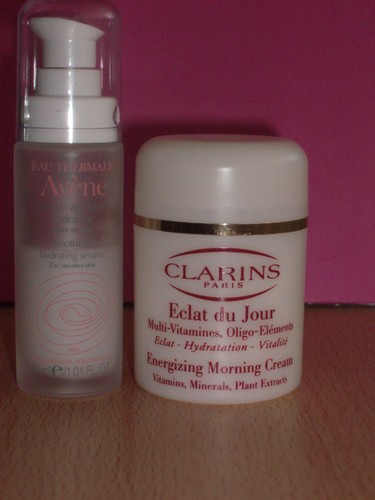 De manhã ponho o SÉRUM APAISANT HYDRATANT da AVÉNE e o creme ÉCLAT DU JOUR da CLARINS.