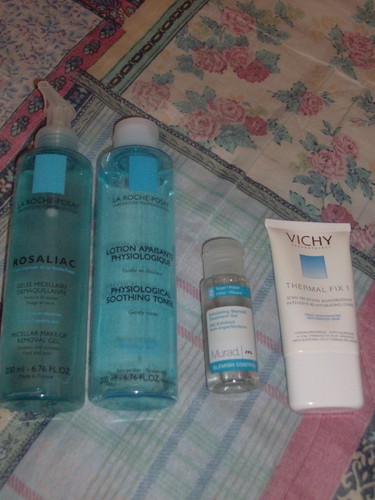 À noite utilizo a GELLÉE DEMAQUILLANTE e a LOTION APASANTE PHYSIOLOGIQUE da ROCHE POSAY, o EXFOLIATING BLEMISH TREATMENT GEL da MURAD e o THERMAL FIX 1 da VICHY.
