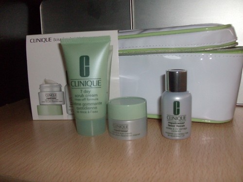 Uma contém SOLUÇÕES ANTI-IDADE com produtos da linha REPAIRWEAR - um serum de 15ml e um creme de olhos de 7ml (a Clinique é bastante generosa!).