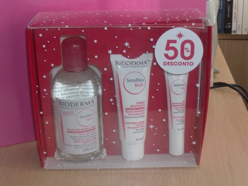 Começo pelo Pack de Natal SENSIBIO da BIODERMA que contém a SOLUTION MICELLAIRE H2O, super-conhecida e com hordas de fans em todo o mundo, o hidratante CRÈME APAISANTE RICHE, para pele sensivel, intolerante e hiper-reactiva, versão super hidratante e o GEL CONTOUR DES YEUX, gel-creme de olhos descongestionante, tensor e reafirmante. Este pack custa 25,99€, 50% do valor dos três produtos comprados em separado. Eu acho k o desconto é um bocadinho mais dos 50%, porque são tamanhos normais!